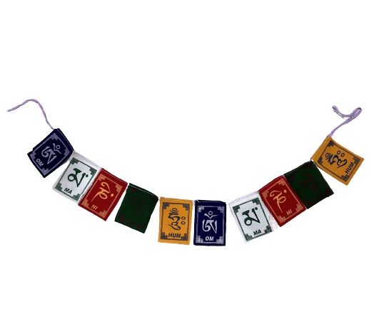 Banderas de oración tibetana con el mantra om mani padme hum importadas de India mediante comercio ético
