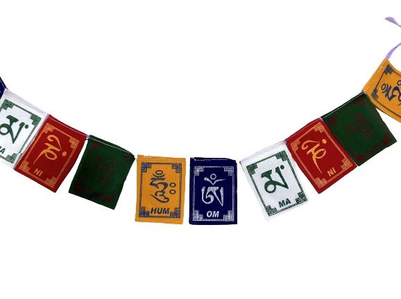 Banderas de oración tibetana con el mantra om mani padme hum importadas de India mediante comercio ético