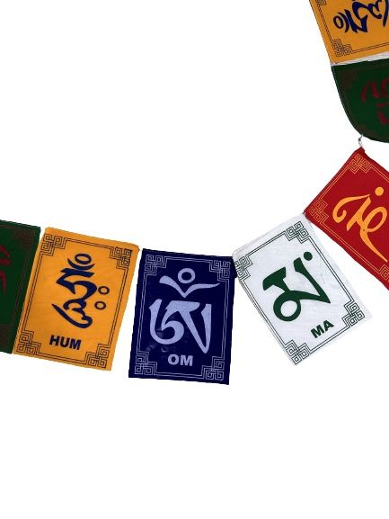 Banderas de oración tibetana con el mantra om mani padme hum importadas de India mediante comercio ético