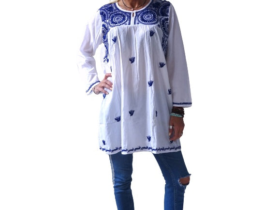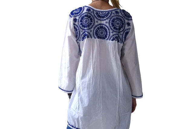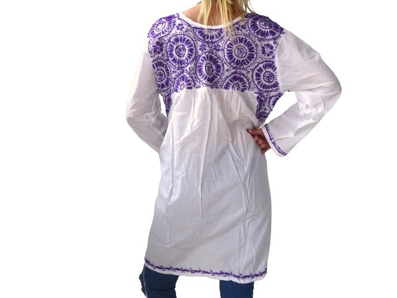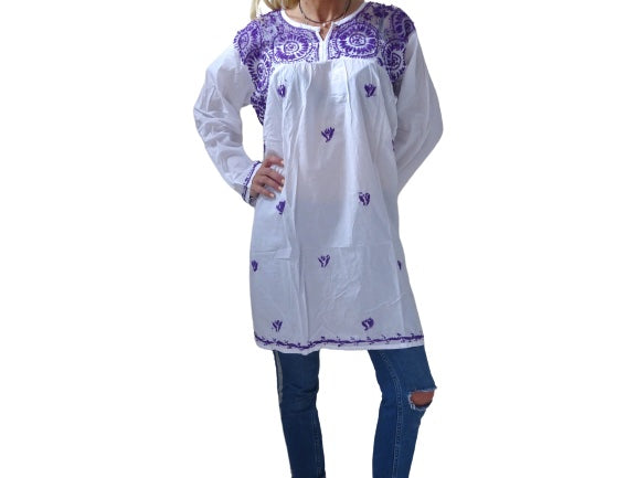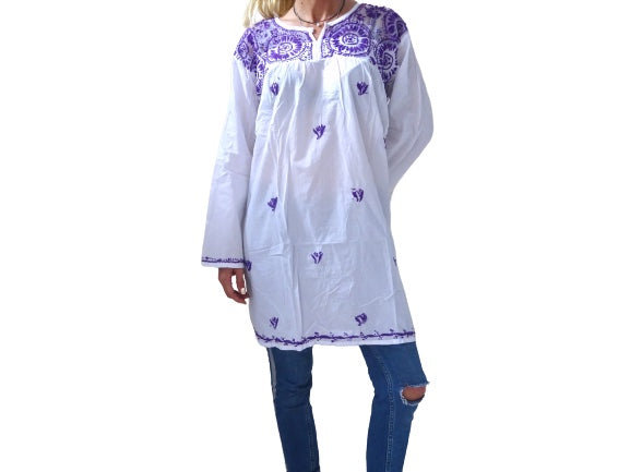 Camisola larga de algodón bordada manga larga de color blanco importada de la India a través de comercio ético.