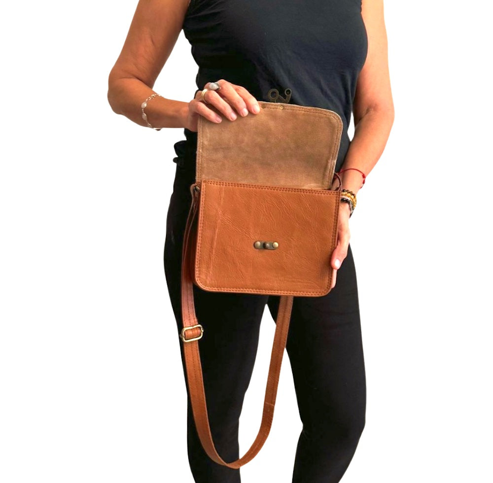 Bolso bandolera indio de piel marrón importado de la India a través de comercio ético.