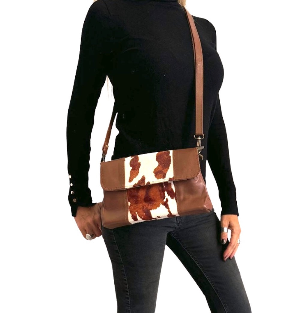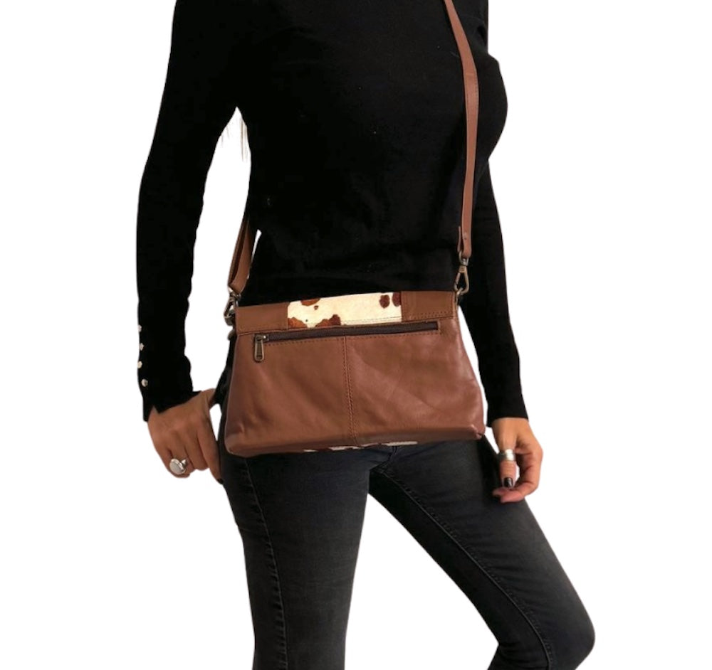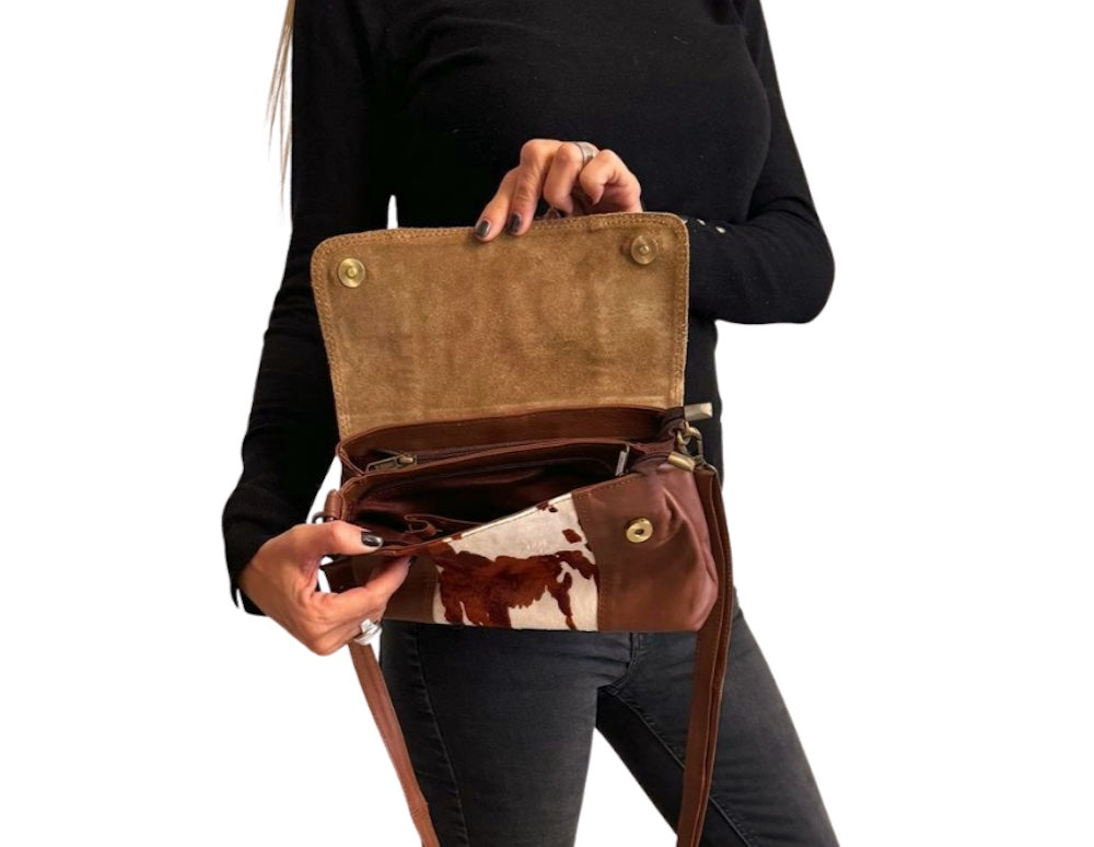 Bolso bandolera indio de piel marrón estampado vaca importado de la India a través de comercio ético.