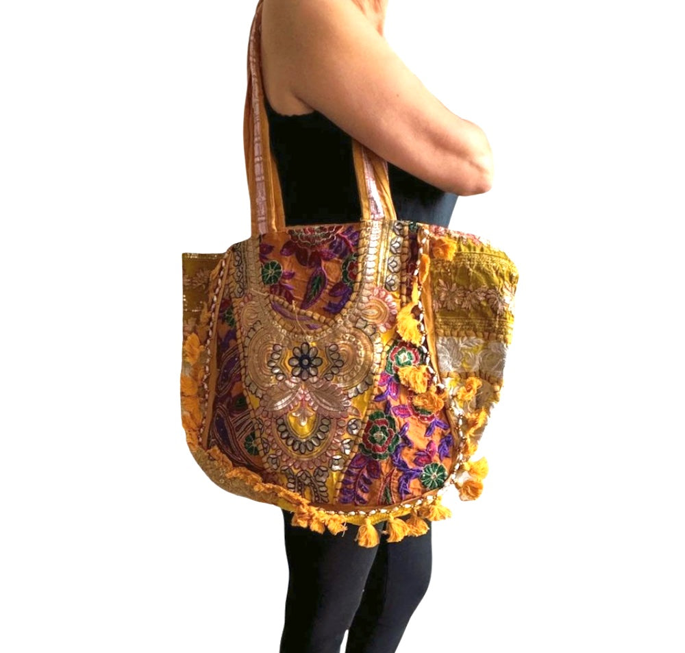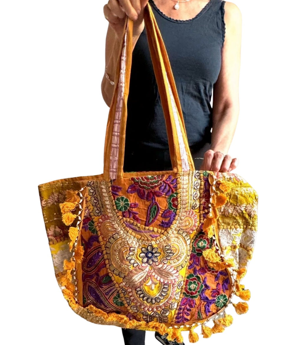 Bolso bohemio amarillo con pompones importado de la India a través de comercio ético.