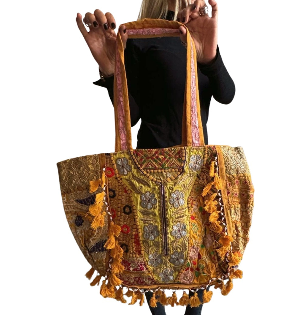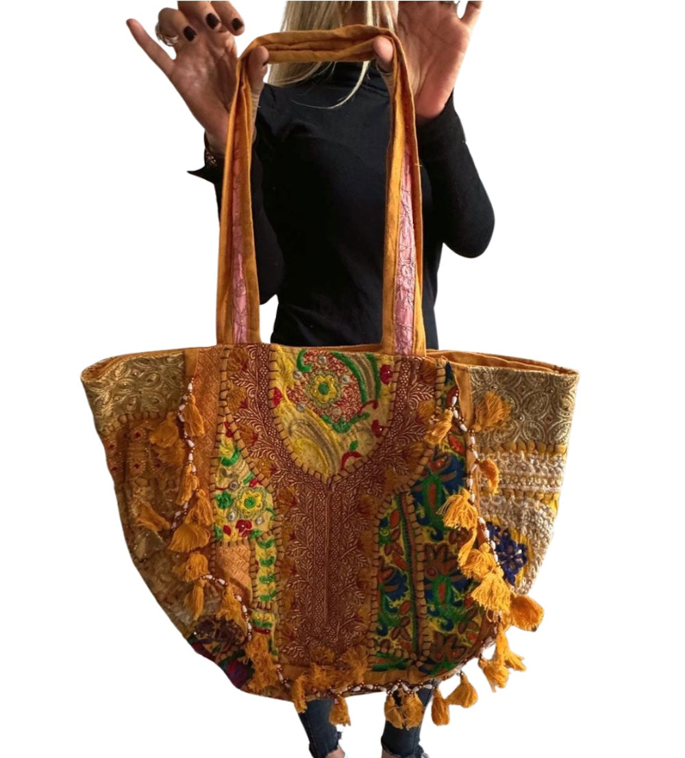 Bolso bohemio amarillo con pompones importado de la India a través de comercio ético.