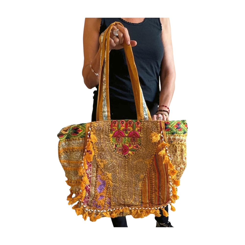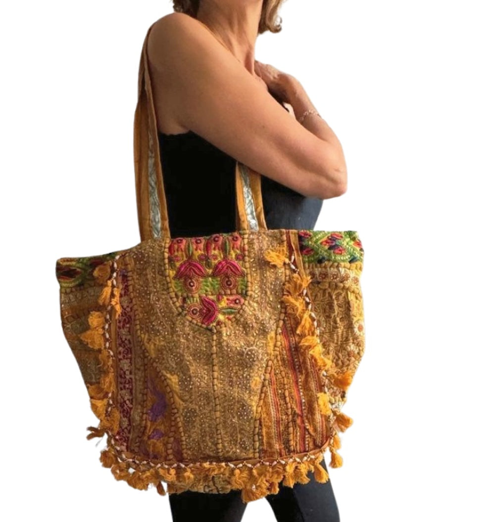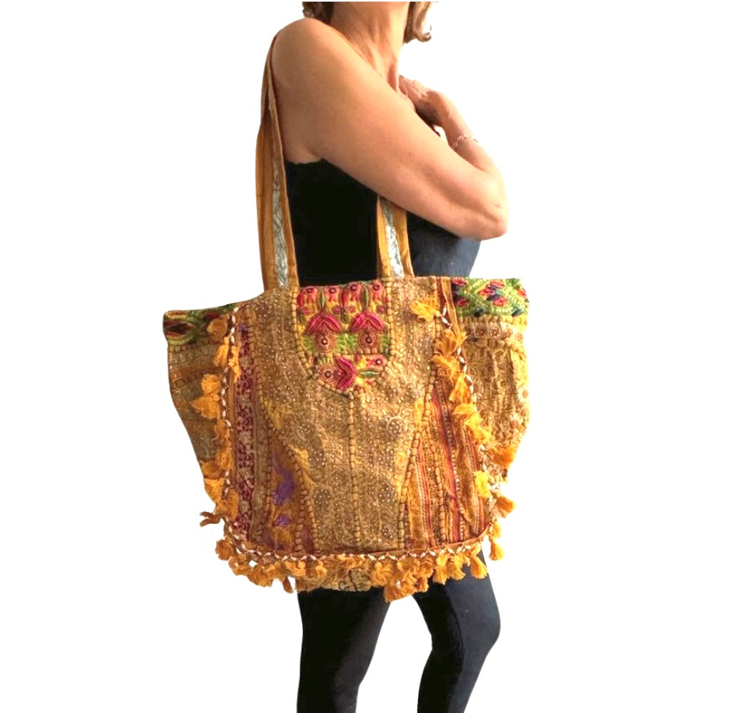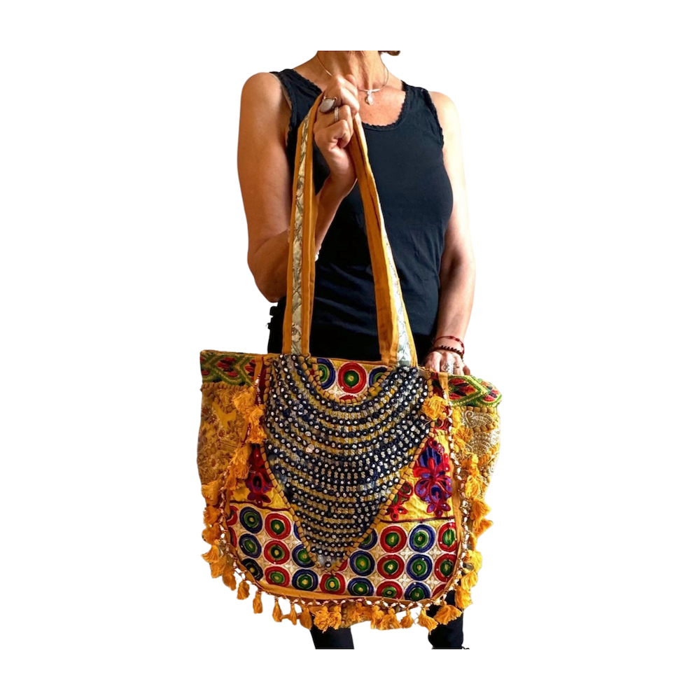 Bolso bohemio amarillo con pompones importado de la India a través de comercio ético.