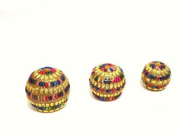 Cajita ovalada decorada con cristales de colores elaborada de forma artesanal en las calles de la India e importada a través de comercio ético.