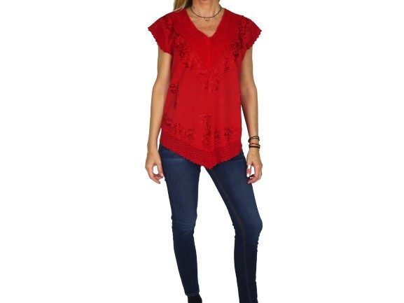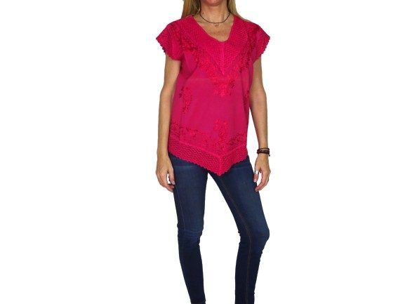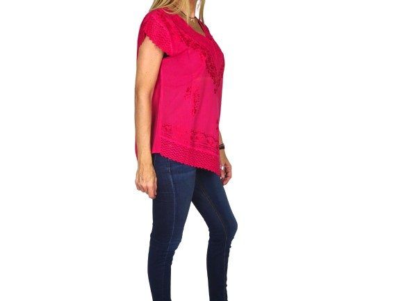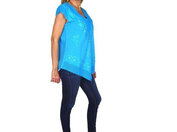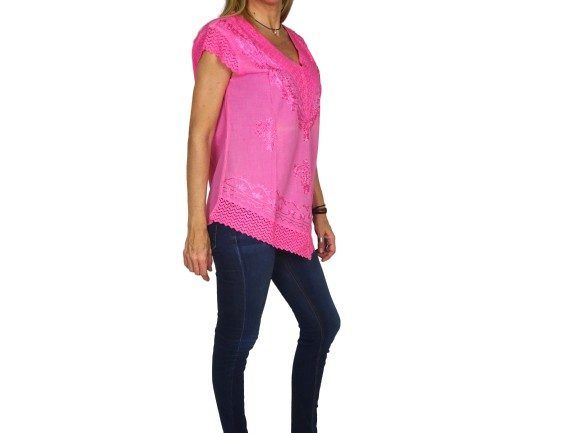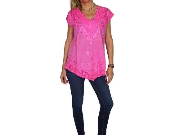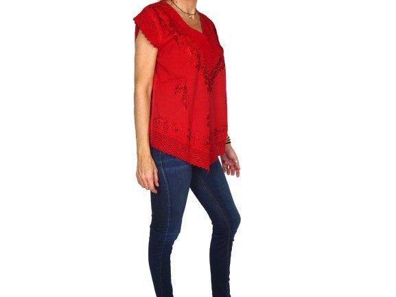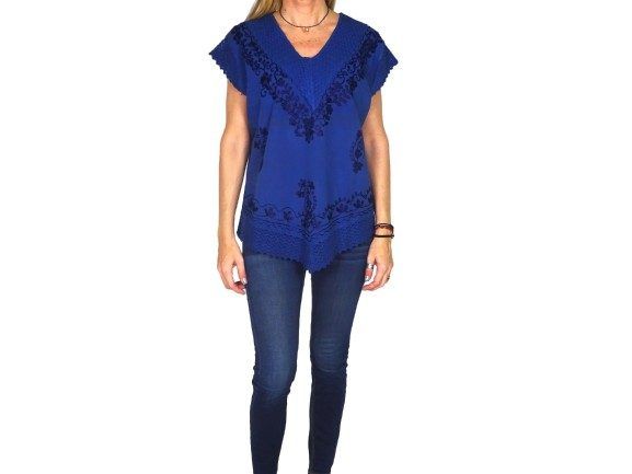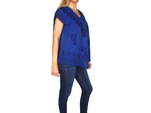 Camisa india de algodón bordada con cuello y borde acabado en pico, importada de la India a través de comercio ético.