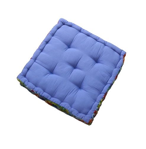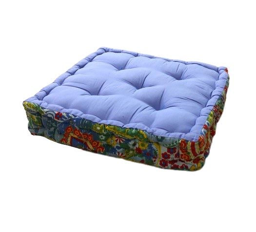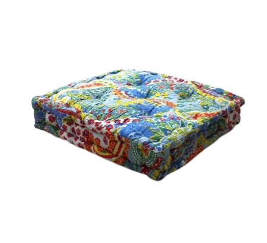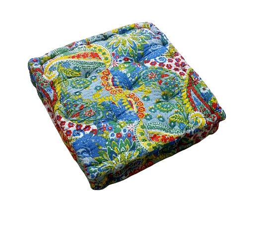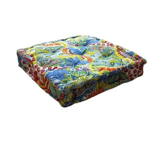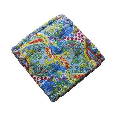 Cojín de meditación étnico indio estampado importado de India a través de comercio ético de forma cuadrada.