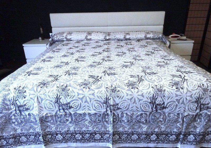Colcha india de algodón con estampados transparentes y flores importada de la India mediante comercio ético.
