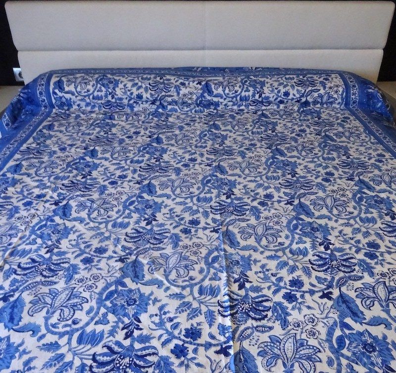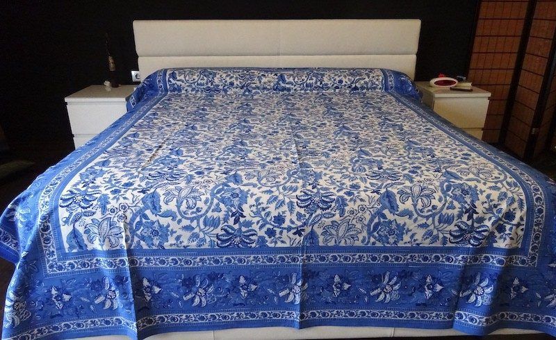 Colcha india de algodón con estampado de flores azules importada de la India mediante comercio ético.