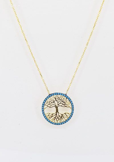 Collar de arbol de la vida de plata bañada en oro con circonitas tintadas de turquesa