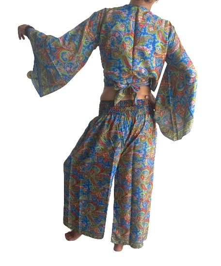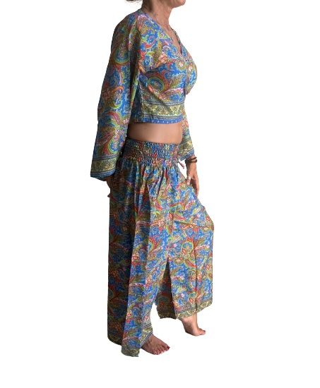 Conjunto de blusa y pantalón ancho de seda india importado de la India a través de comercio ético.