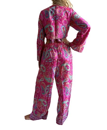 Precioso conjunto formado por camisa de seda de manga larga estampada y pantalón ancho de seda que se ajusta a la cintura mediante cinta y goma elástica.