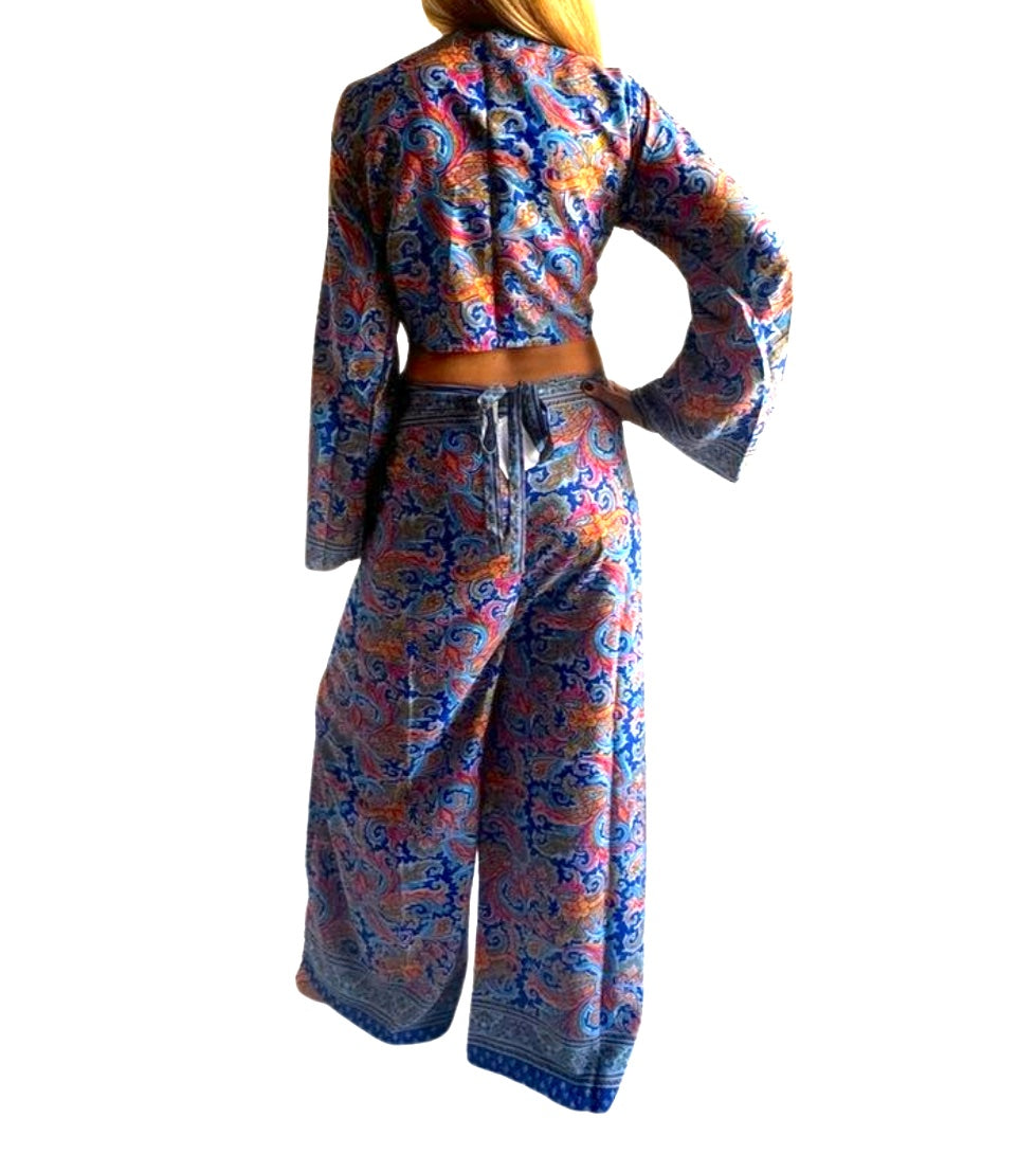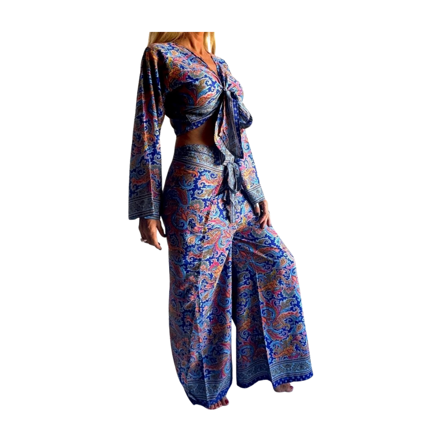 Precioso conjunto formado por camisa de seda de manga larga y pantalón de seda superpuesto que se ajusta a la cintura mediante cinta