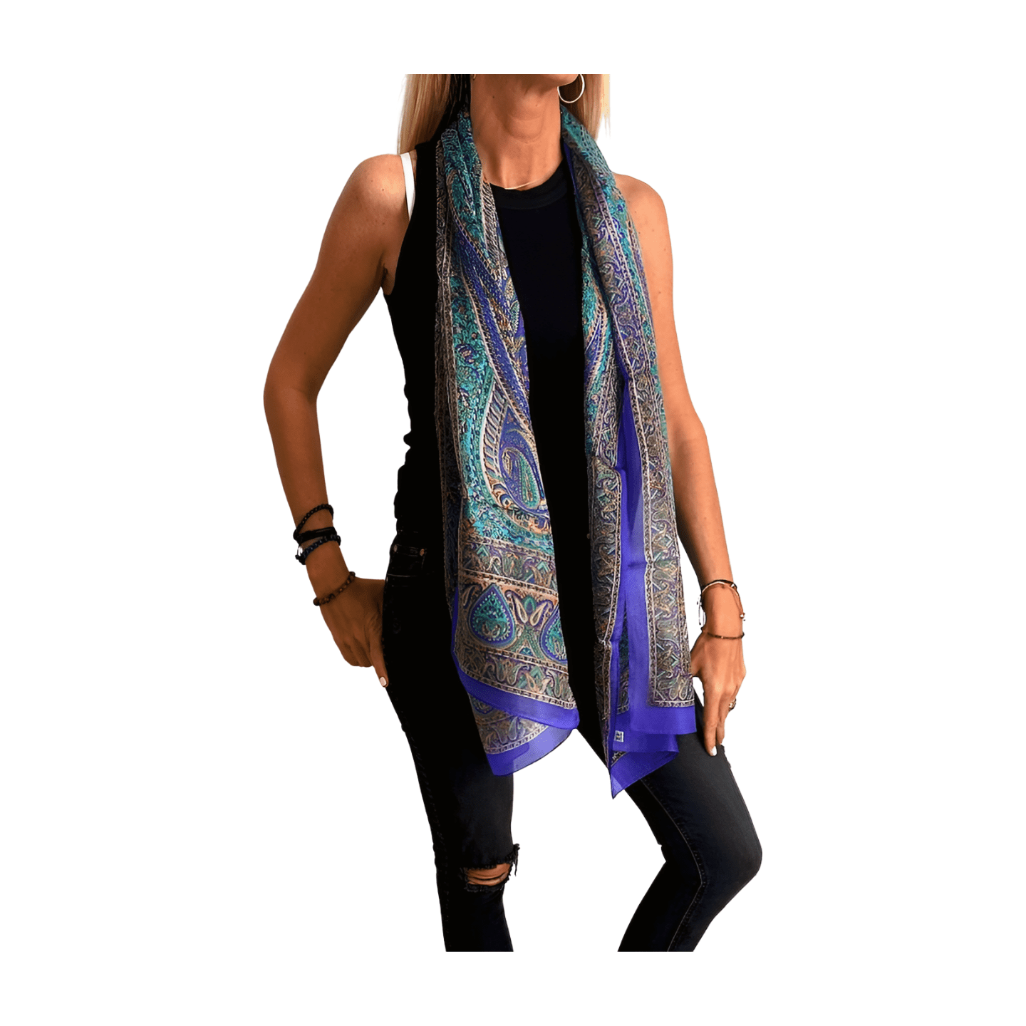 Foulard de seda de la india estampado azul importado de India a través de comercio ético.