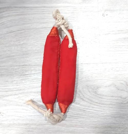 - Dos líneas de campanas de latón atadas con almohadilla roja.