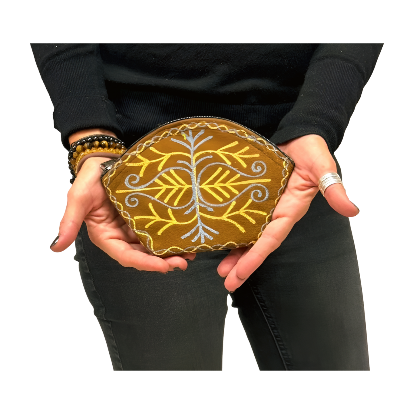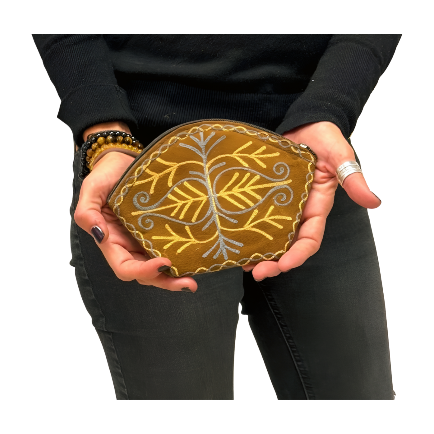 Monedero indio de piel marrón bordado en azul y amarillo importado de India a través de comercio ético.