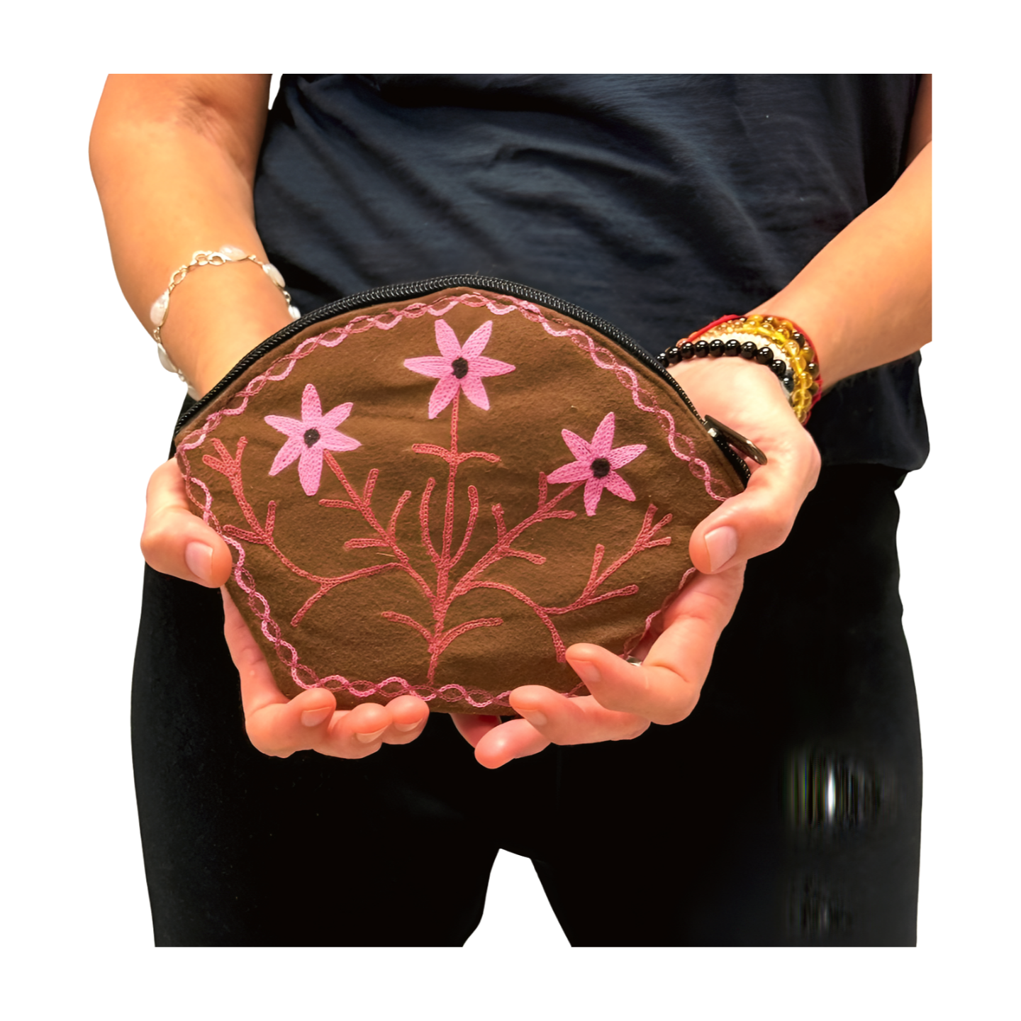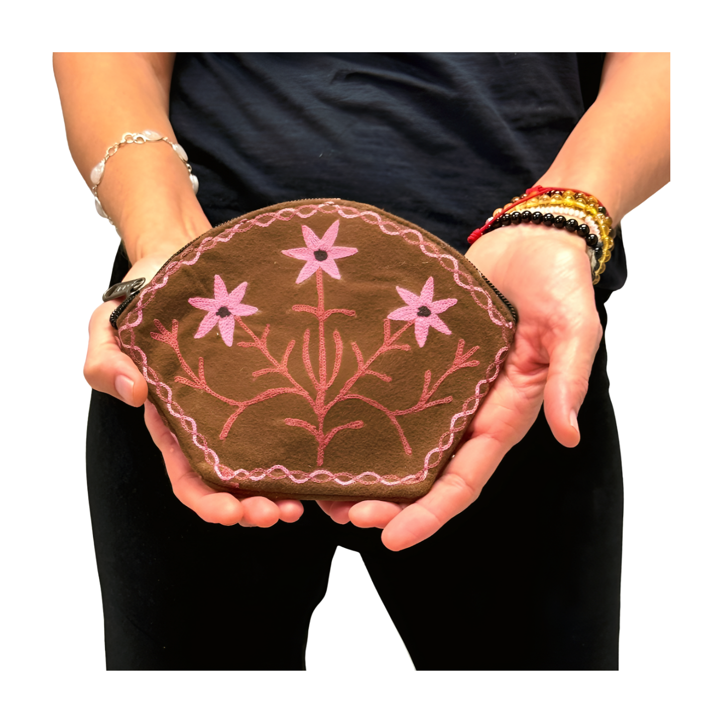 Monedero indio de piel marrón bordado en granate y rosa importado de India a través de comercio ético.