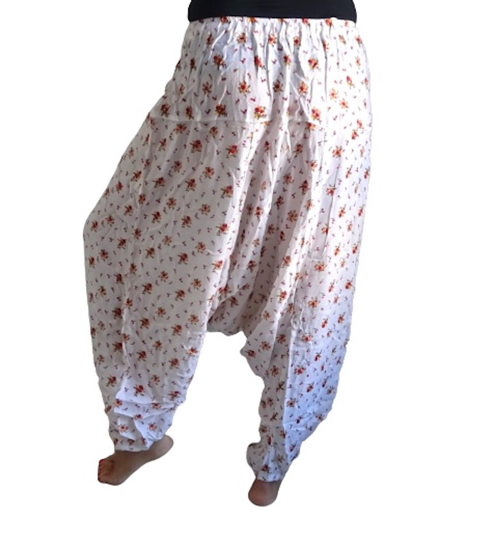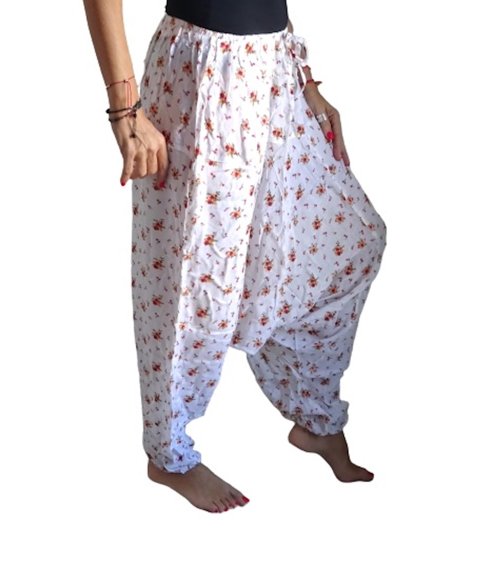 Pantalón afgano indio blanco con estampado floral de rayón importado de India a través de comercio ético.