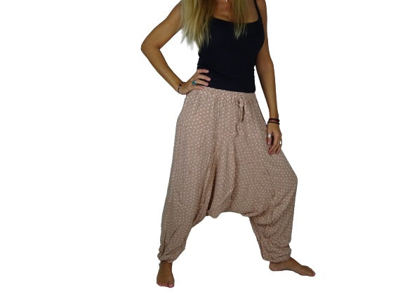 Pantalón afgano indio camel con topitos blancos de rayón importado de India a través de comercio ético.