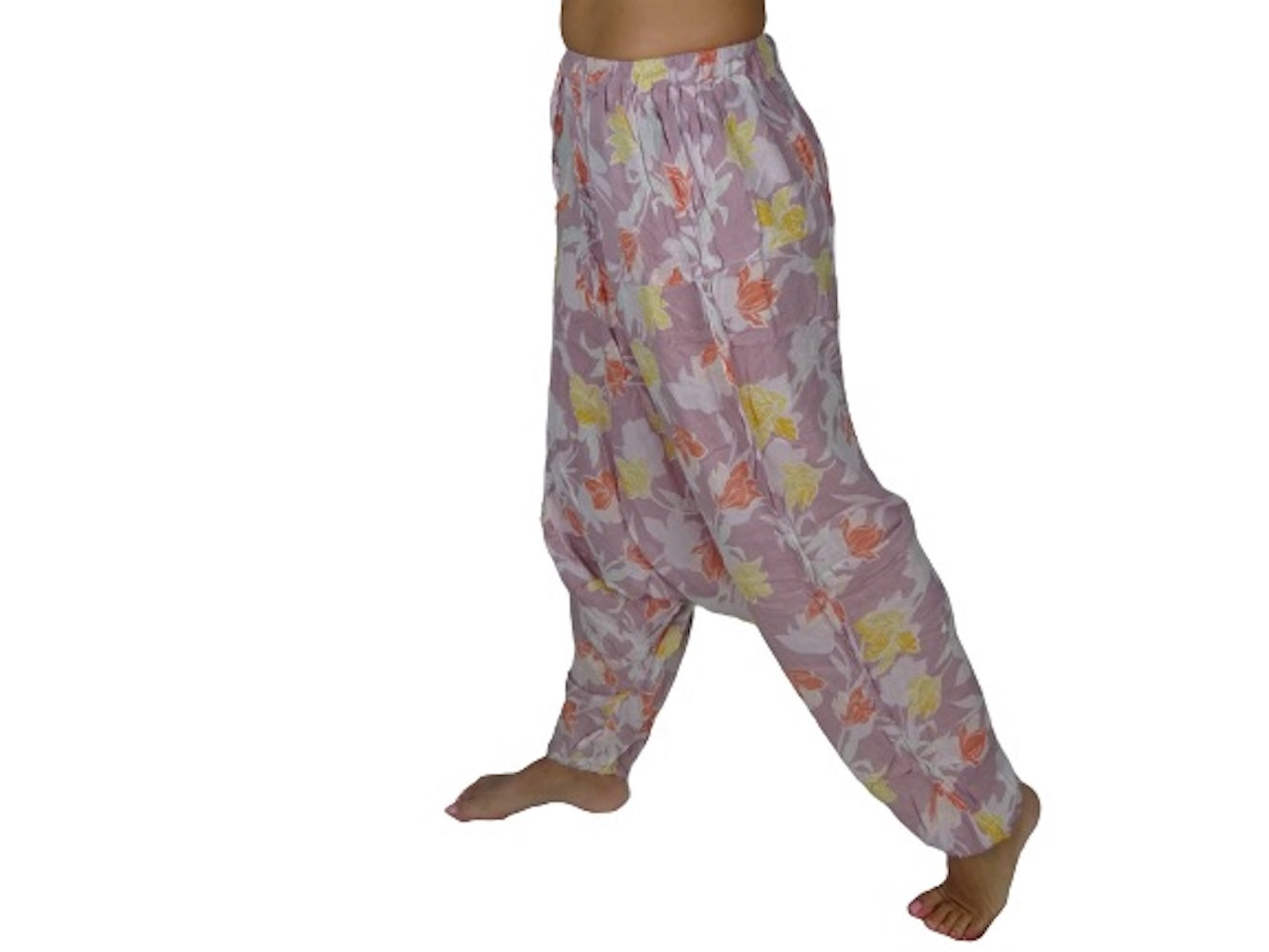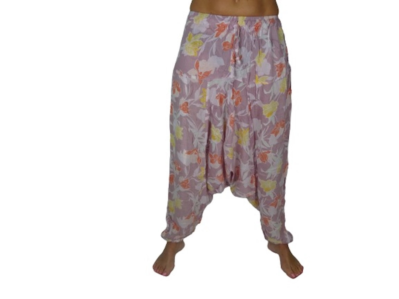 Pantalón étnico indio tipo afgano color malva y estampado floral de rayón importado de India a través de comercio ético.