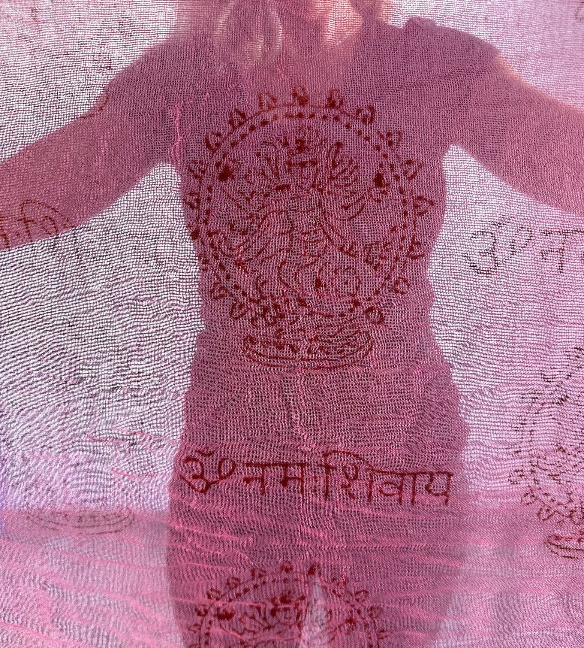 Este foulard de algodón fino estampado con mantra OM solo o combinado con algún dios hindú.