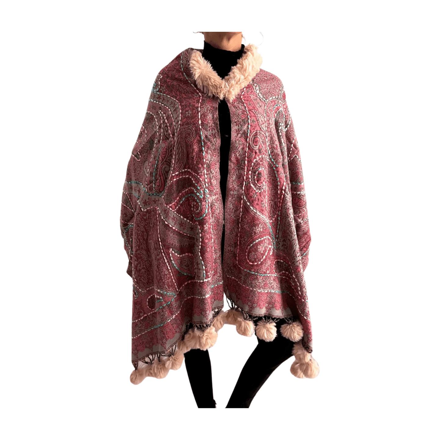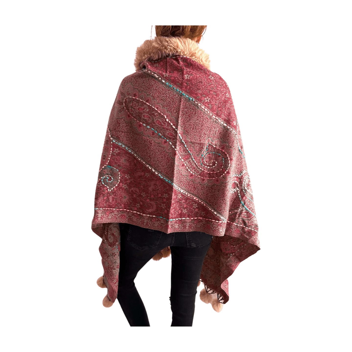 Pashmina de lana de alta calidad con borlas y cuello de pelito importada de India a través de comercio ético.