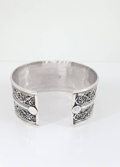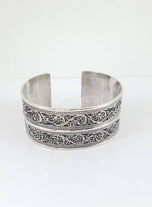 Brazalete ancha de plata rígida grabada importada de la india mediante comercio ético.