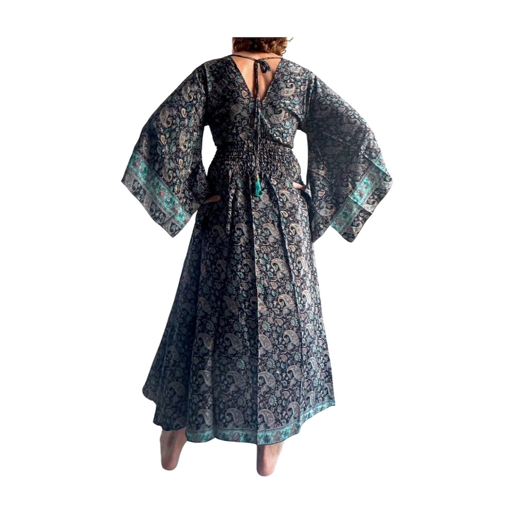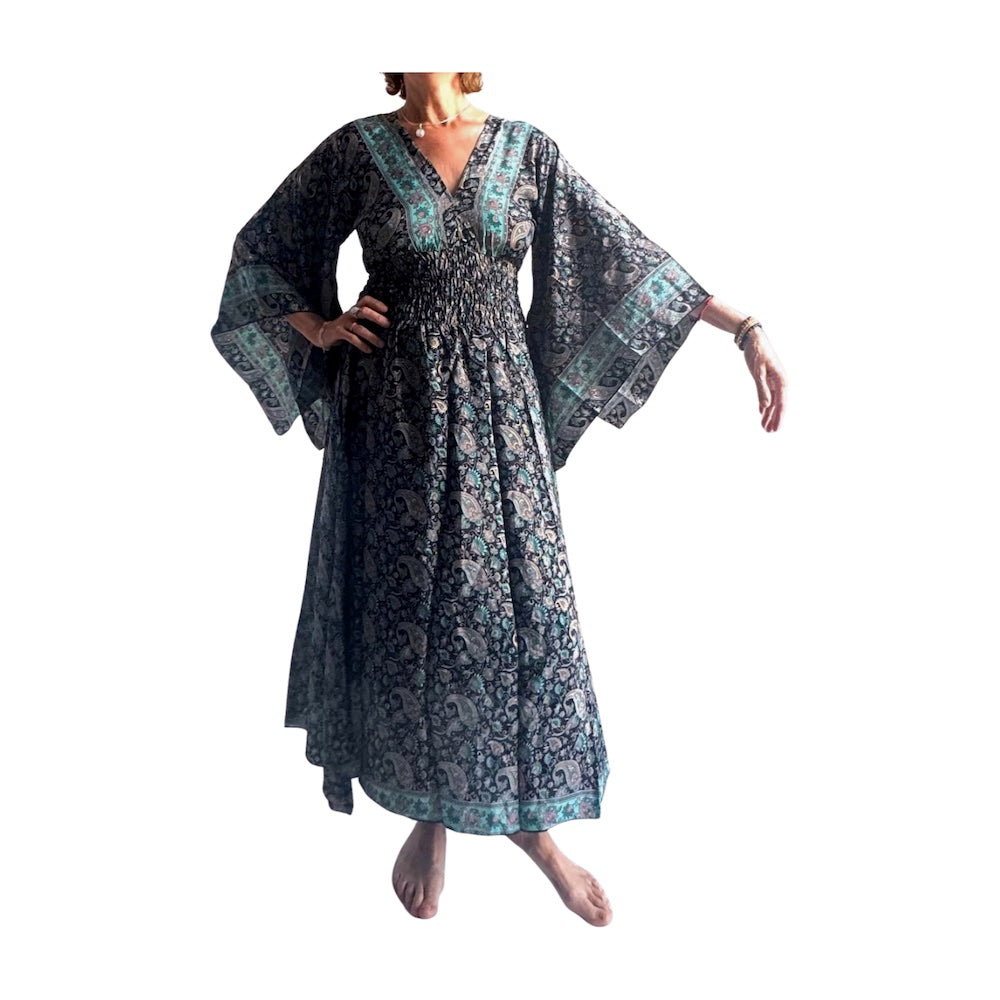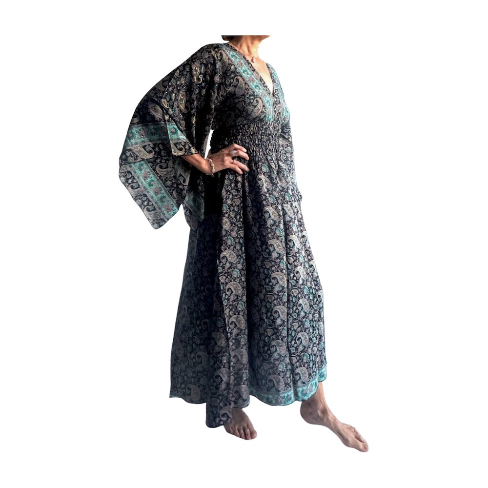 Vestido indio estampado de seda importado de India mediante comercio ético.