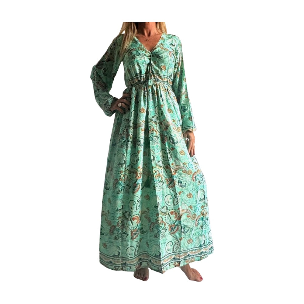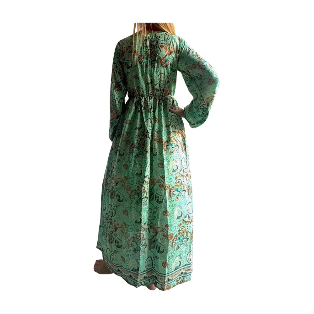 Vestido indio estampado de seda importado de India mediante comercio ético.