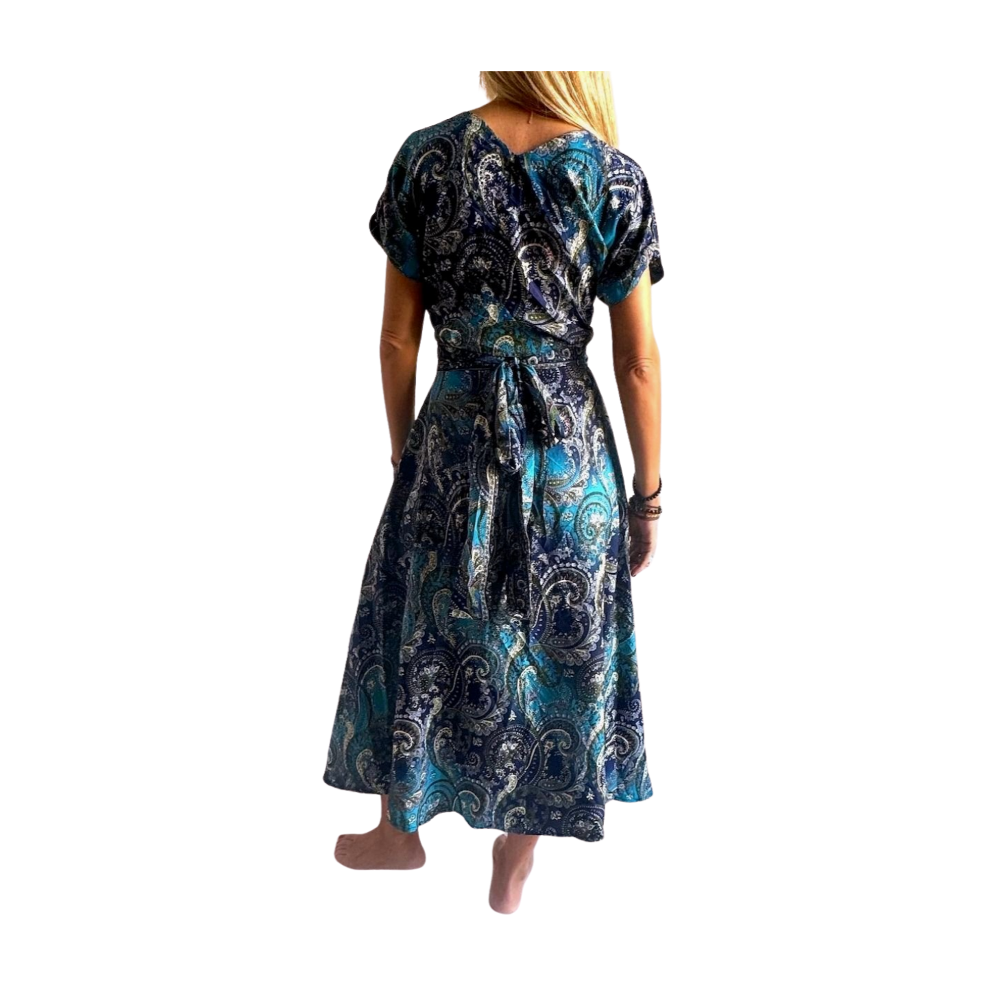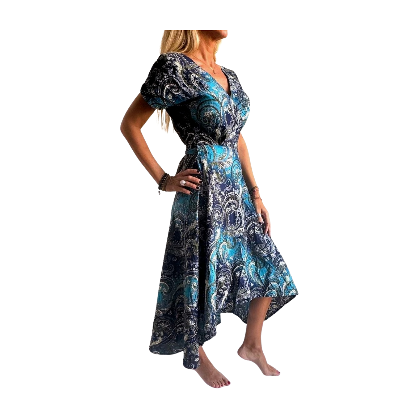 Vestido indio estampado de seda importado de India mediante comercio ético.