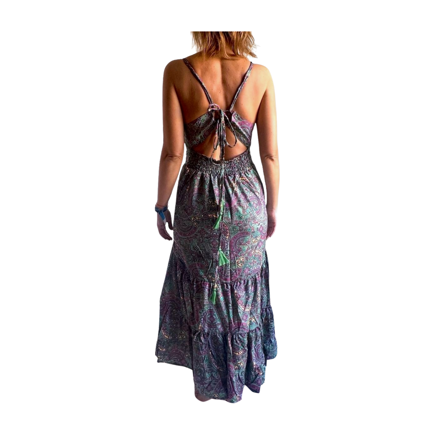 Se ajusta a la cintura mediante goma elástica y cintas que se entrelazan dejando la espalda descubierta.