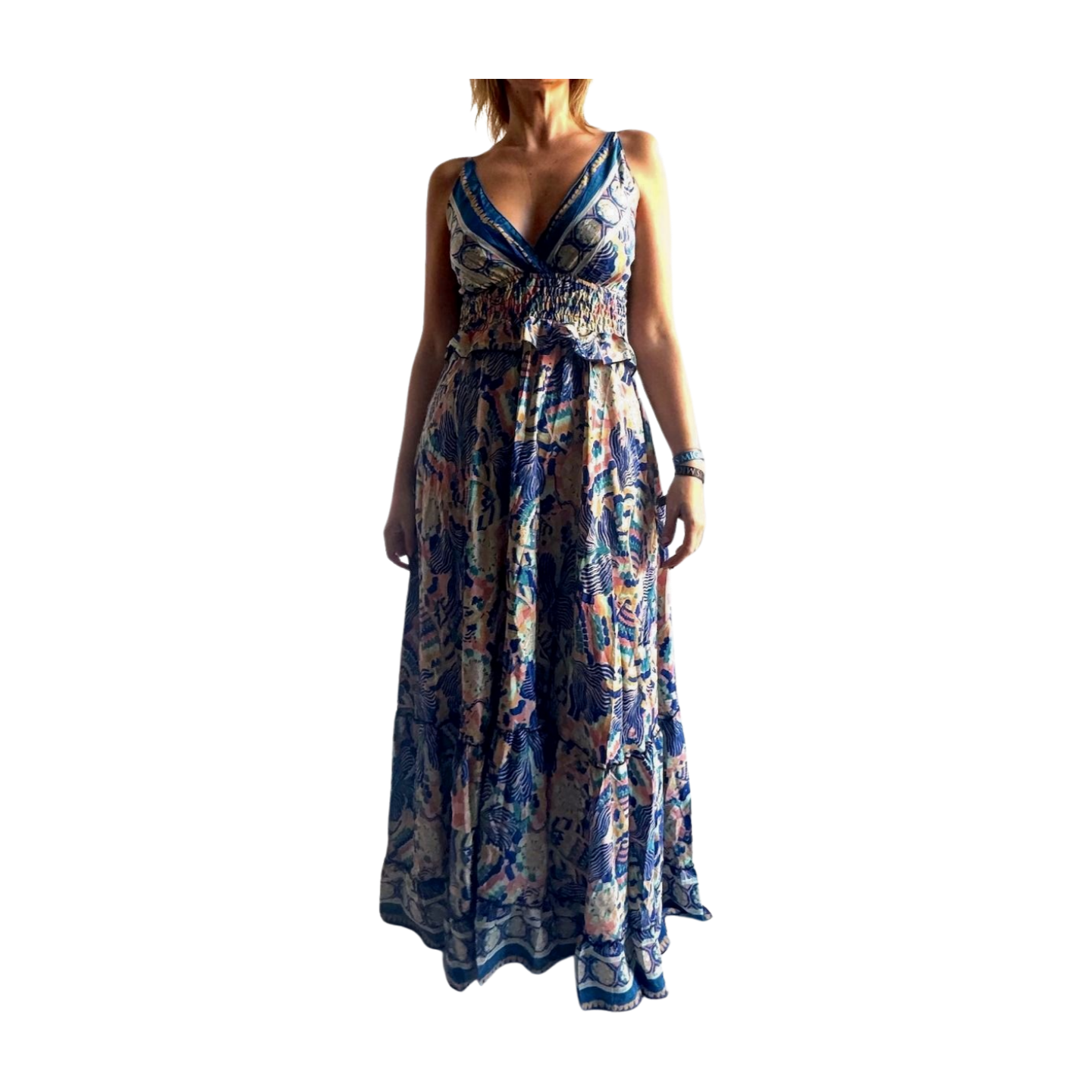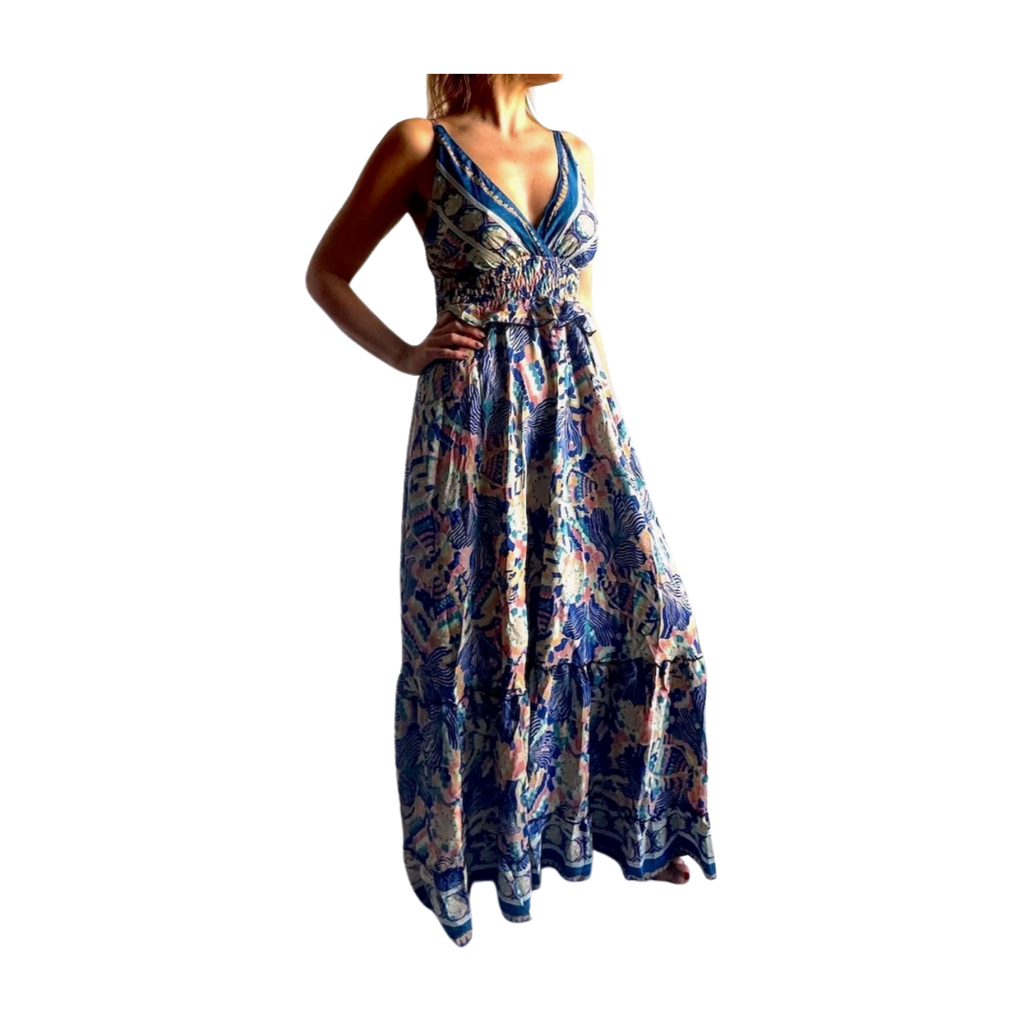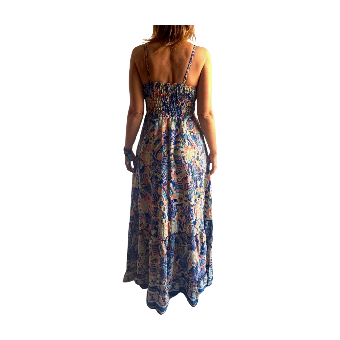 Vestido indio estampado de seda importado de India mediante comercio ético.