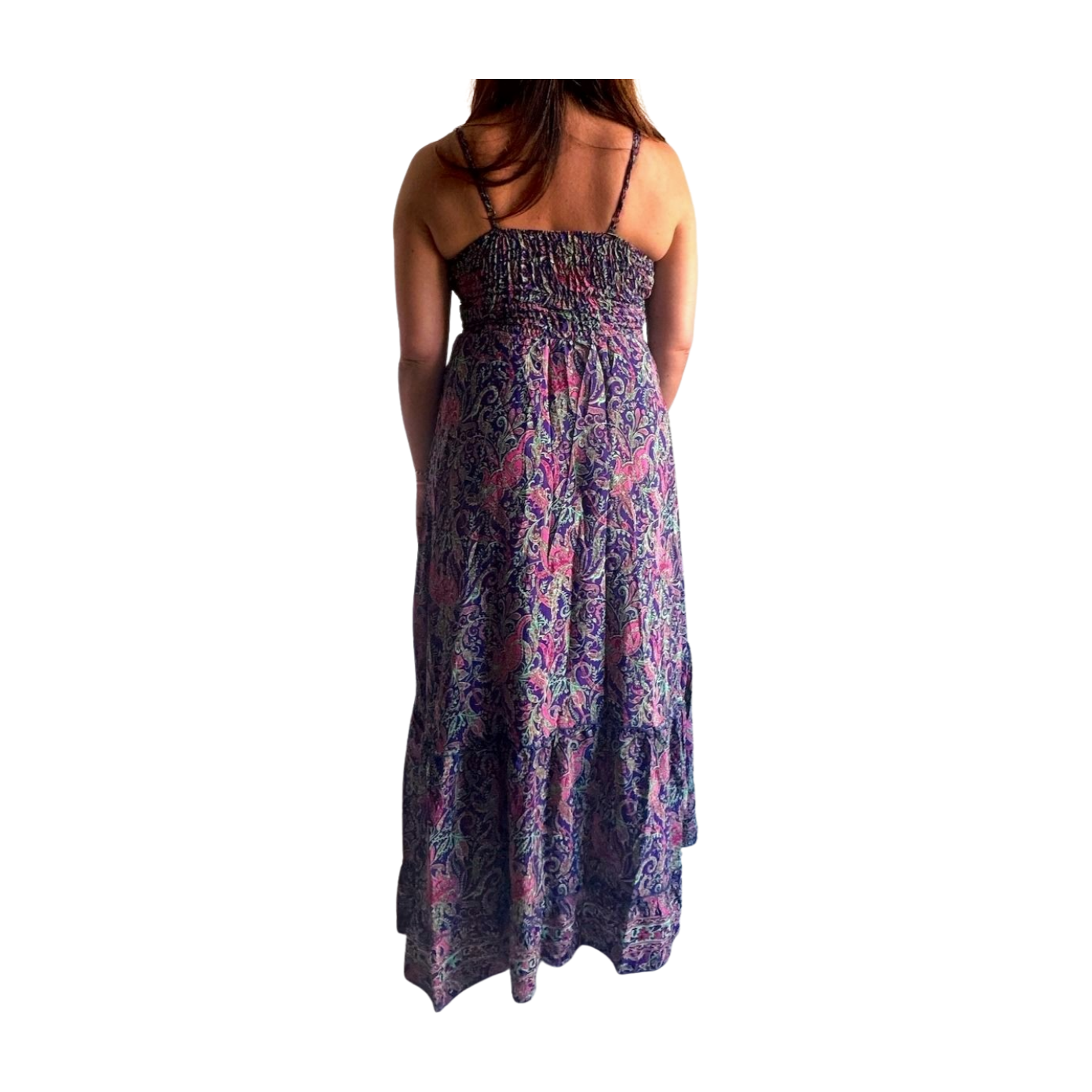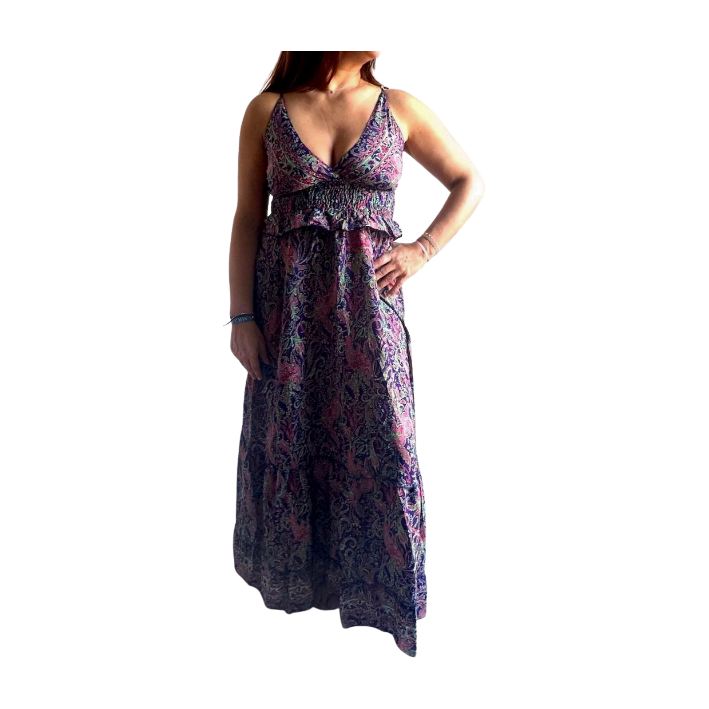 Vestido indio estampado de seda importado de India mediante comercio ético.